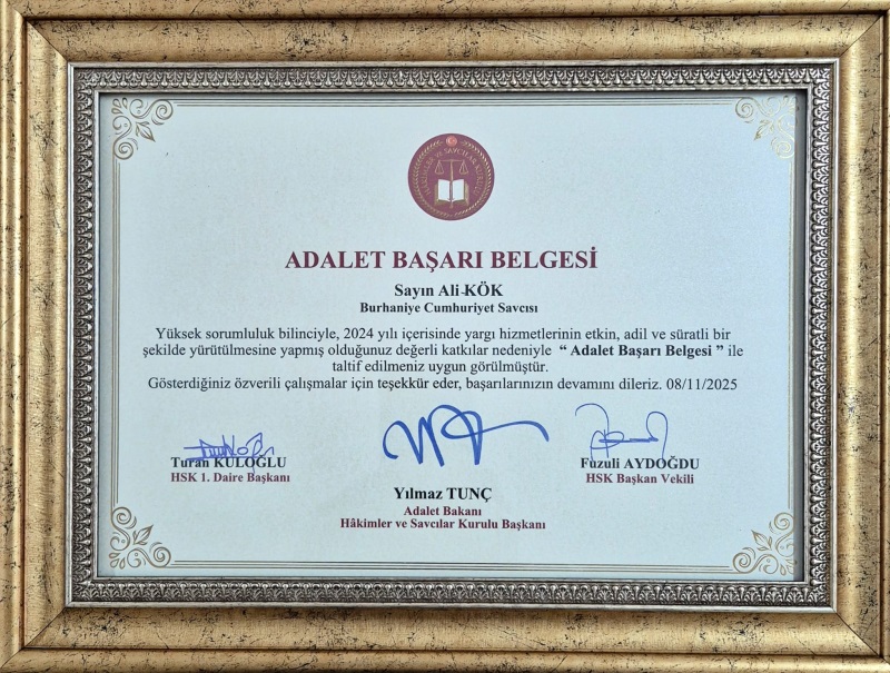 Burhaniye Adliyesi Cumhuriyet Savcısı sayın Ali KÖK, Hakimler ve Savcılar Kurulu tarafından ''Adalet Başarı Belgesi'' ile ödüllendirilmiştir. Burhaniye Cumhuriyet Başsavcısı sayın Turgay Osman TAŞ ve Burhaniye Adliyesi Komisyonu Başkanı sayın Eser EKİCİ tarafından başarı belgesi kendilerine takdim edilmiştir.
