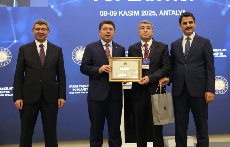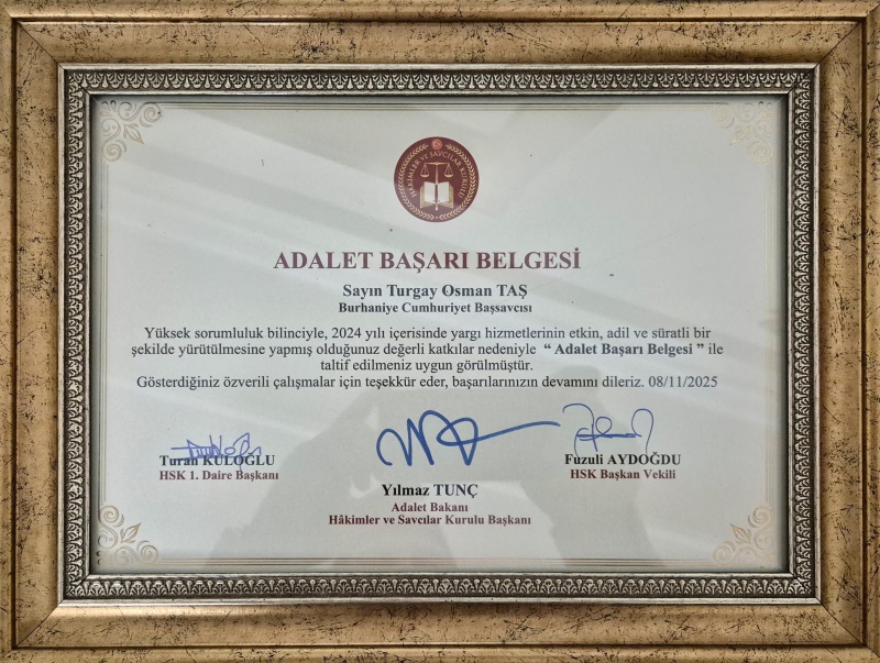 08-09 Kasım 2025 tarihinde Antalya ilinde gerçekleştirilen Yargı Teşkilatı Toplantısında adaletin tecellisi konusunda başarılı çalışmalara imza atan yargı mensuplarının başarı belgesiyle ödüllendirilmesi kapsamında; Sayın Adalet Bakanı Yılmaz TUNÇ ile Hakimler ve Savcılar Kurulu Daire Başkanları Fuzuli AYDOĞDU ve Turan KULOĞLU tarafından, Burhaniye Cumhuriyet Başsavcısı Turgay Osman TAŞ'a ''Adalet Başarı Belgesi'' takdim edilmiştir.